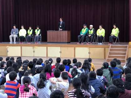 「1年間安全に登校を見守っていただきありがとうございました。」の感謝の気持ちを全校児童と教職員がお伝えする場となっています。
