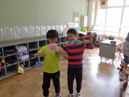 角の大きさを回転の大きさととらえるために,折り紙と割り箸を使って扇を作りました。実際に作ったものを動かすことで,角の大きさを体で感じていました。