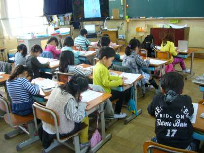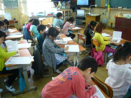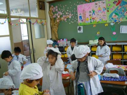 自分の名前を書きました。それから、給食当番の用意をしました。