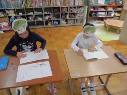カエルになりきって,「春のうた」という詩を読んでいます。今日は,雨が降って中庭でもカエルが鳴いていました。ケルルン クックと喜んでいるねと詩を思い出して話が膨らみました。