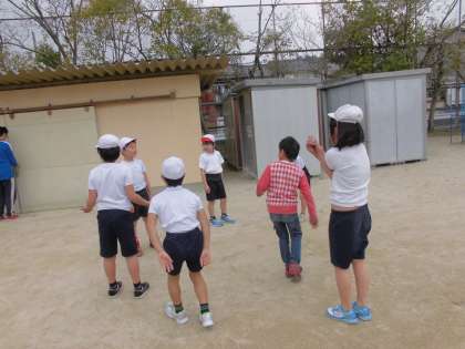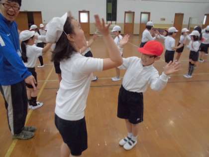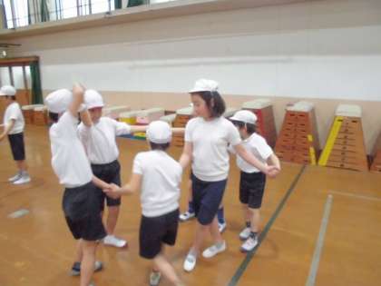 今日から4年生と一緒にリレーだ!!と意気込んで外に出ると準備体操をしていると雨が・・・体育館に避難して,体ほぐしの運動をしました。手押し相撲や人間ちえの輪などみんなで楽しみました。