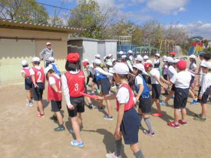 今日はお天気も良く,体育をしていると汗ばむくらいの陽気でした。バトンパスの練習をしっかりして一生懸命走りました!!