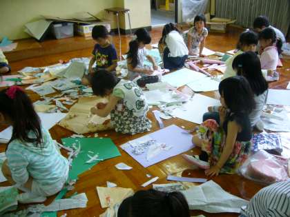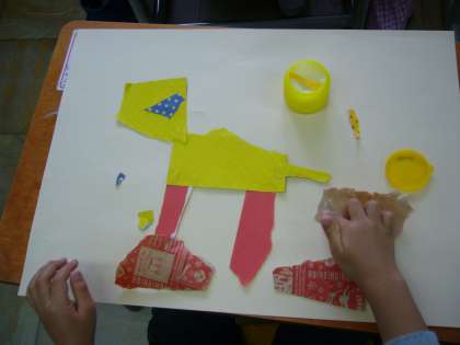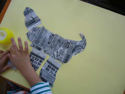 お家から持ってきた紙をやぶいて、そこから形を自分なりに見つけ、イメージして作りました。さて、どんな作品になるのか,楽しみです。