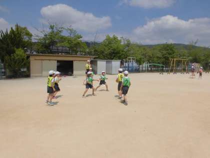 体育の交流学習で,ポートボールをしています。ボールを受けたり,投げたり,仲間に声かけをしたり,チームで協力しながら楽しんでいました。