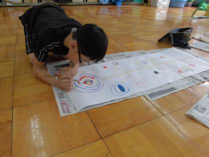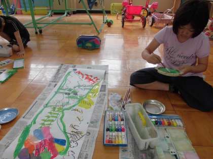 線描した「まぼろしの花」を絵の具を使って彩色しました。自分の思い描く花に近付けるために,ていねいに塗っていました。