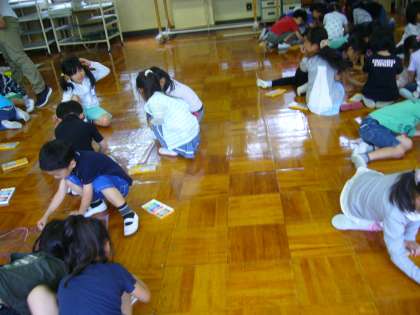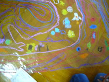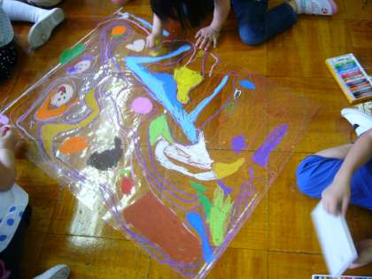 一年生では造形活動をたくさんします。みんながそれぞれ譲り合いながら一枚の透明シートに線をかいたり、絵をかいたりしました。