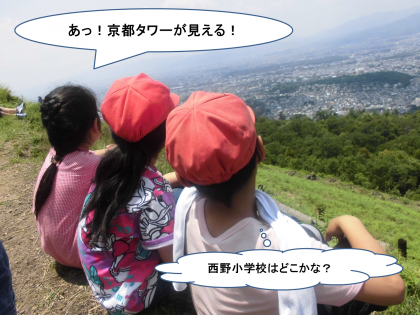 それでも,励まし合いながら火床まで登り切った子どもたちは,眼下に広がる京都市の風景に感動していました。自分たちが調べた京都タワーや平安神宮を見つけて,大興奮でした。そんな中で一番多かった質問は,「西野小学校はどれですか?」でした。残念ながら,大文字山の火床から西野小学校は見えません。まだまだ,京都市内の施設の位置を把握する学習が必要です。3年生はこれからも,京都市の様子を調べ続けます。