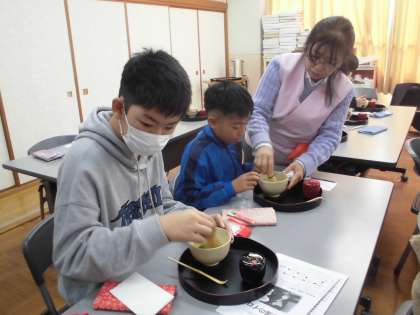 裏千家の師範の方を講師にお招きし、6年生を対象に「茶道教室」を開催していただきました。帛紗の使い方やお茶のたて方など、丁寧に教えていただきました。