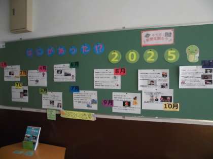 もうすぐ12月です。にじいろ図書館に、「2025年を振り返ろう」というコーナーが作られました。子どもたちが興味深そうに立ち止まる様子が見られます。