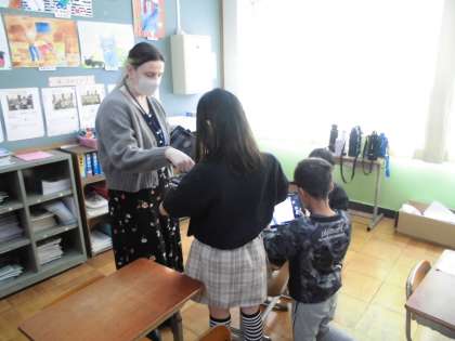 自分だけのオリジナルピザを作るために、食材を集めました。ALTのドリュー先生にも協力していただき、英語を使って友達からほしい食材をもらうことができました。どんなピザが出来上がるのか楽しみです!