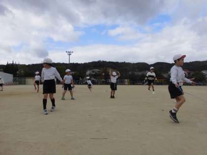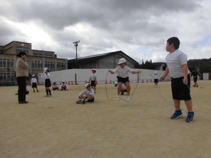 2年生は体育の時間に、なわとびの色々な技に挑戦しています。リズムよく跳ぶことは難しそうですが、励まし合いながら頑張っています。