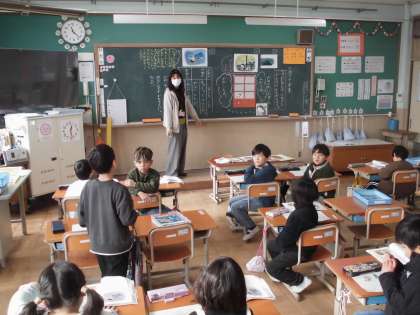 国語の時間に「たぬきの糸車」を読んでいる1年生。今日も、おかみさんやたぬきの気持ちについて話し合いました。自分の考えを友達に上手に伝えることができました。