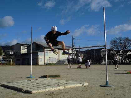 6年生は体育の時間に、走り高跳びをしていました。助走の長さや空中姿勢などを工夫して、記録更新を目指しています。