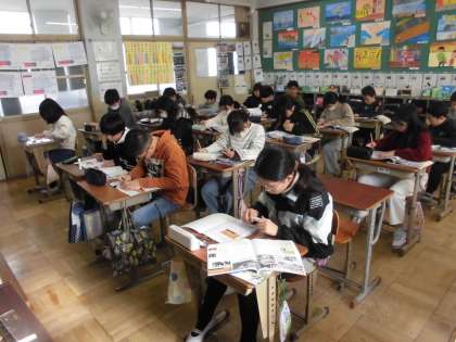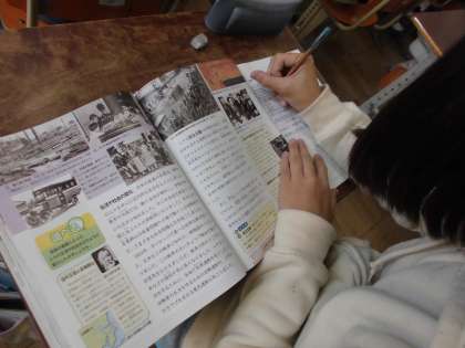 産業が発展したことで、人々の生活はどのように変化してきたのでしょうか。6年生は社会の時間に、資料を使って学習問題について調べていました。資料から考えられることを積極的に交流し、みんなで学習を深めています。