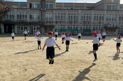チャレンジしている跳び方の練習はもちろん、前跳び競争などで盛り上がっています。また、休み時間に縄跳びを楽しむ子もいます。