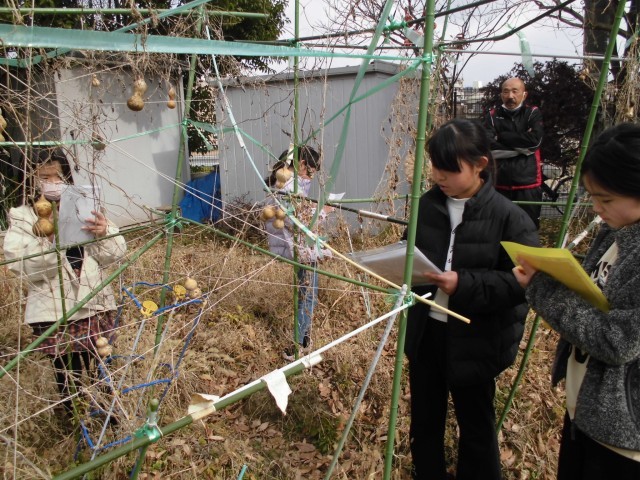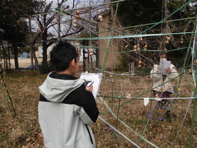 4月から観察を続けてきたヘチマやツルレイシ、春や夏、秋の時の状態と比べてどんな変化があるかな。植物の生長はたくさんの変化があり、季節ごとに観察することでその変化にも気づくことができます。長い目で見ていくことも大切にしていきましょう。