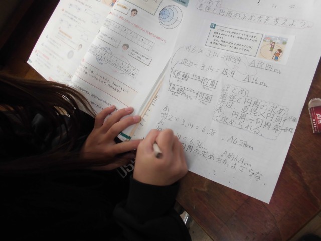 5年生は、円の特徴について学習しています。今日は半径や円周の長さの求め方を確認しました。