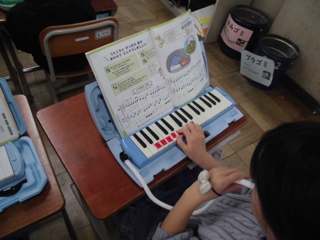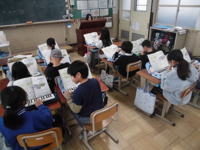 2年生は音楽の時間に、鍵盤ハーモニカの練習をしていました。みんなでタイミングを合わせて合奏したり、歌声と合わせたりしています。