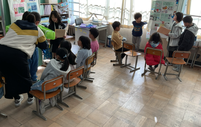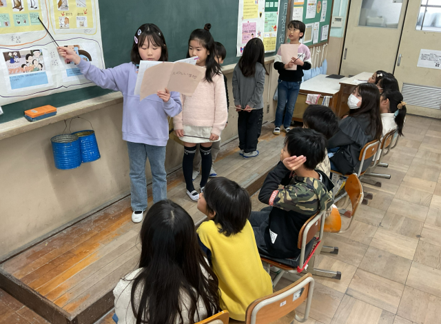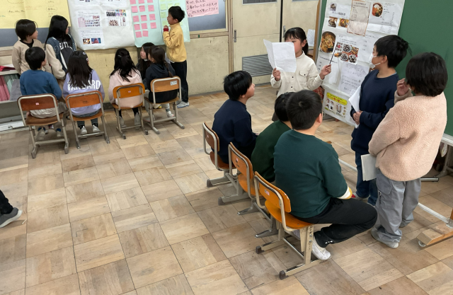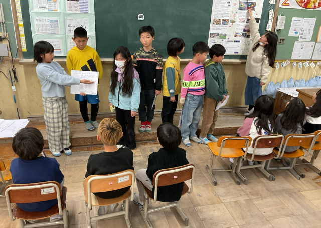 先週金曜日、学習発表会に向けて取り組んできたことを、隣のクラスの友だちに向けて発表し合いました。