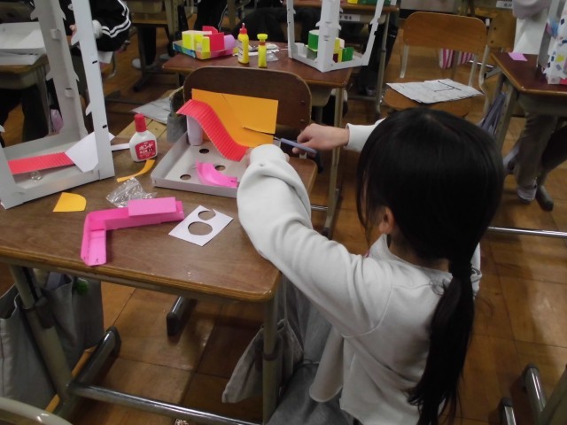 ビー玉の通り道は土台の中だけではない!?枠から外れたコースを作ったり、隠し通路があったりと工夫してコースづくりをしています。それぞれのテーマにそって作っていきましょう!