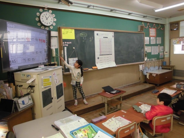 1年生は算数の時間に、「大きい数」について学習しています。今日は数字の書かれたカードを並べて、空白のカードに当てはまる数字を考えました。