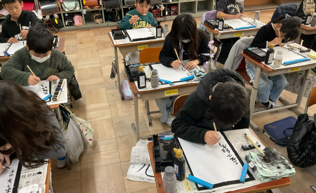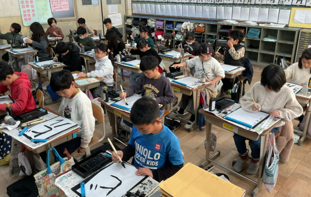 3年生の書写の学習では、毛筆で「曲がり」と「折れ」の筆使いに気を付けて字を書く学習を行いました。