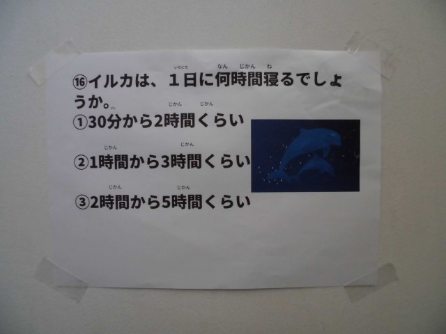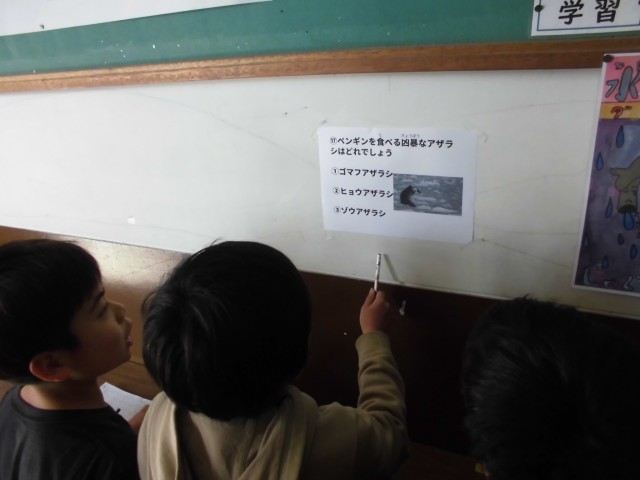 飼育園芸委員が、生き物のことを知ってもらうためのクイズを作りました。校内の様々な場所に、生き物に関するクイズが貼られています。休み時間には、たくさんの子どもたちが解答用紙を持って校内を回っていました。なかなか難しい問題もありますね…。