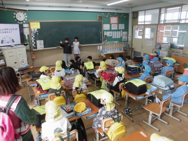 今日は山階保育園・洛東幼稚園の年長さんが西野小学校に来てくれました。1年生は年長さんにランドセルを背負わせてあげたり、小学校での過ごし方について伝えたりしました。新1年生の入学を、みんなで楽しみに待っています。
