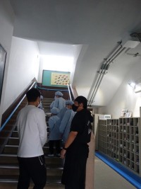 6年生に教わりながら、サービスホールに入りました。どこに何があるのかを確かめなが...