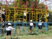 総合遊具や鉄棒を使った運動をしました。「3点支持(両手・両足のうち3か所を遊具に...