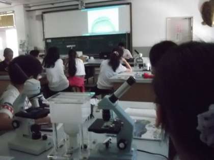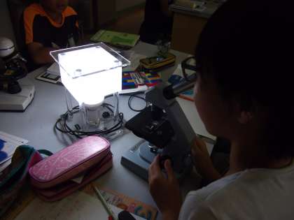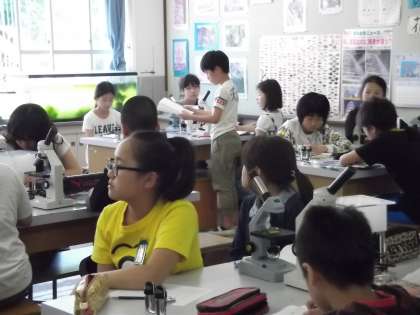 5年生はメダカの卵の成長の様子をスライドを見ながら学習しています。
