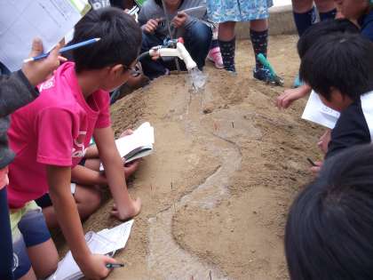 「流れる水のはたらき」の学習で,造形砂場に川を作り実験をしました。