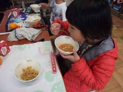 「トマトスープ」も温かく,具もたくさん入っていて「おいしい。」「うまい。」と適度な酸味を味わっていました。
