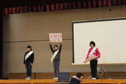 全員で「ビリーブ」を合唱し,児童朝会が始まります。