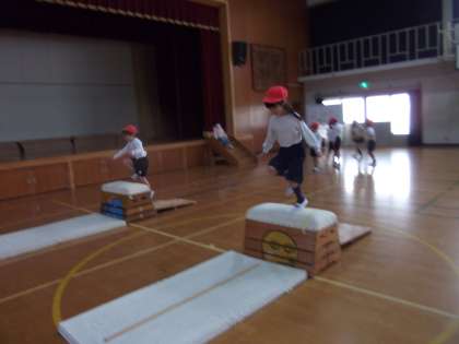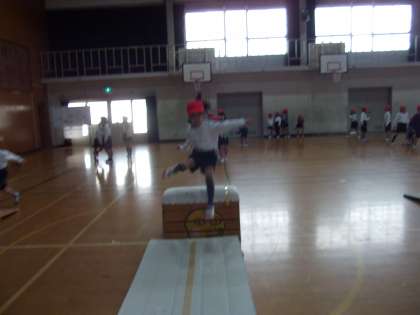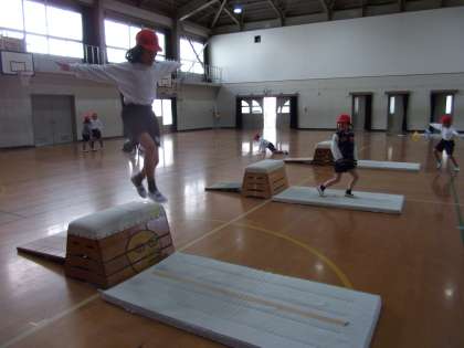 跳び箱に跳び乗ったり,飛び降りたりして楽しんでいます。