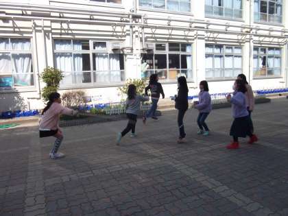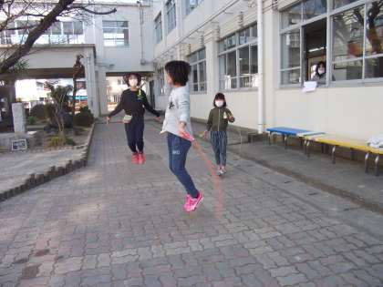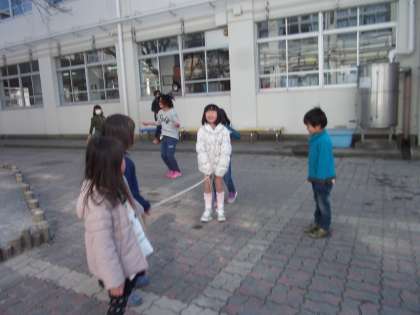お昼休みに中庭でいろいろな学年の児童がなわとびを楽しんでいました。
