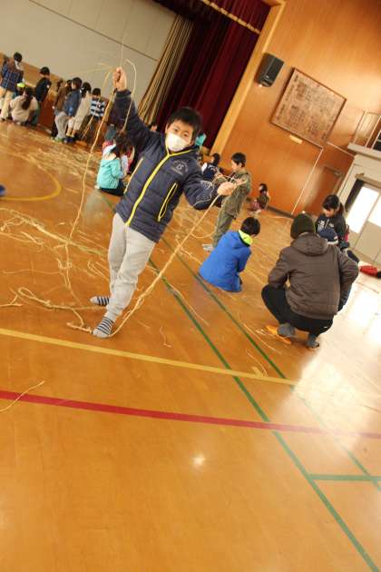 地域の方々に来ていただき,手取り足取り指導を受けてわらをよって縄を作りました。