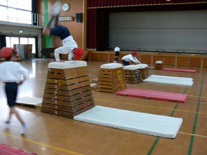 どの子も必死で取り組んで,さらに高い段を跳び越すことや少し頑張ればできそうな跳び越し方に挑戦して楽しんでいました。