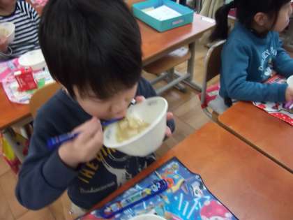今日の給食の味噌汁は,油揚げと切麩,学校で保管していた乾燥した野菜(牛蒡)を使っています。