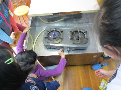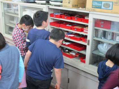 栄養教諭の田畑先生にお手伝いいただいて,家庭科室探検を行いました。