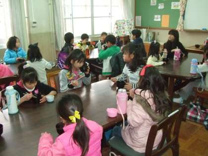 体操で体を動かした後,またまた地域女性会の皆様のご協力で,おいしいおぜんざい!をいただきました。心も体も温まりました。ごちそうさまでした。