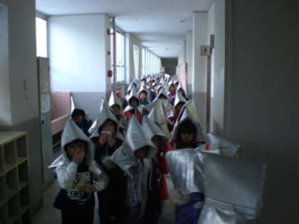緊急放送(火事)をしっかりと聞き,二次避難のため防災頭巾を着用しました。