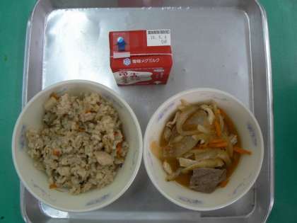 8月29日(水)の給食の献立は,五目ごはん(アルファ化米),牛乳,ぶた汁でした。