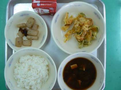 9月5日(水)の給食の献立は,ごはん,牛乳,赤だし,かみなりこんにゃく,夏野菜のかき揚げでした。