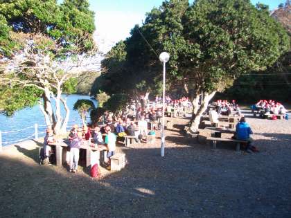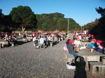 青空の下での朝食です。