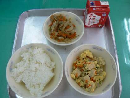 11月9日(金)の給食の献立は,ごはん,牛乳,高野どうふの卵とじ,根菜のごま炒めでした。