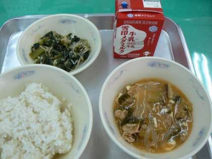 11月12日(月)の給食の献立は,むぎごはん,牛乳,豆腐の四川風,ほうれん草ともやしの炒めナムルでした。