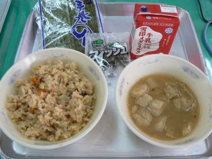 12月14日(金)の給食の献立は,炊き込み五目ごはん,牛乳,みそ汁,じゃこ,手巻きのりでした。