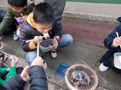 社会科で「昔を伝えるもの」を学習しています。前回は「わらあみ体験」でしたが,今日は「七輪体験」でした。七輪でおもちをやいてみんなで食べました。火を起こすのは大変だったけれど,「レンジで作るおもちよりおいしい!」とみんなおどろいていました。「誕生日プレゼントに七輪がほしいな」と言っている子もいたり,「洗濯板などもっとほかの昔の道具をつかってみたい。」と言っている子もいたりして,昔の道具にきょうみしんしんでした。