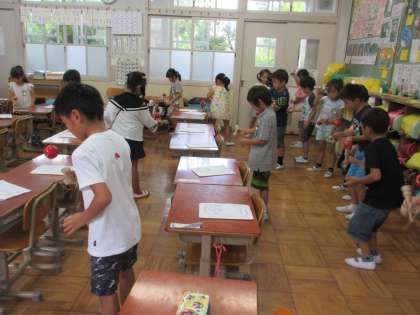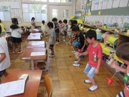 学習発表会に向けて毎日少しずつけん玉練習に励んでいます。けん玉チャンピオンがだんだん増えてきました。技を競い合って,みんな楽しそうです。